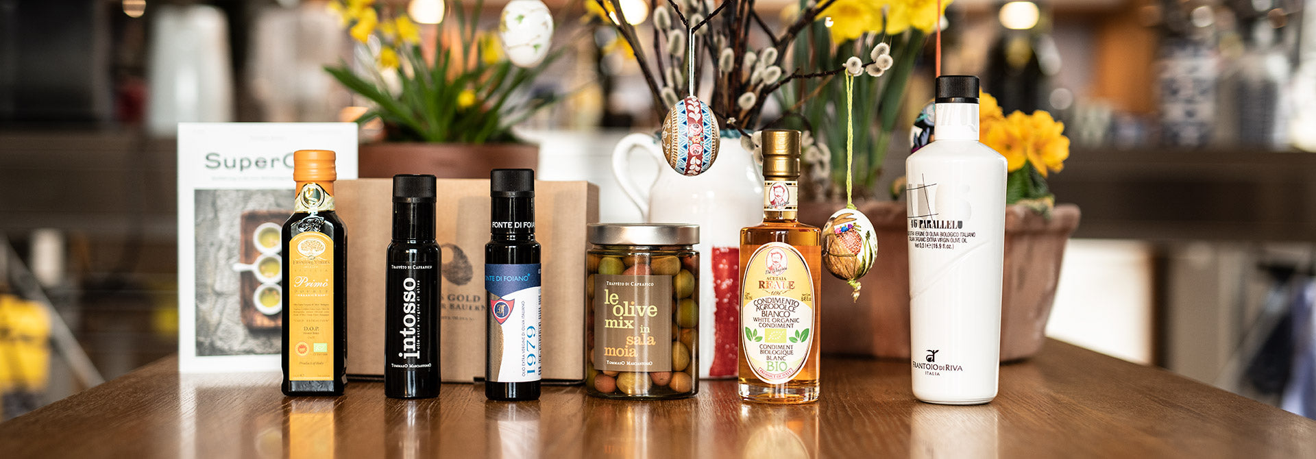 Alle Öle im Shop stammen von der neuen Ernte 2025/26. Außerdem gibt es eine Auswahl an feinen Bio-Essigen aus Modena, Reis aus der Po-Ebene, Tafeloliven, Bio-Marmeladen und Bio-Honig sowie Koch- und Sehnsuchtsbücher für Italien-Liebhaber.